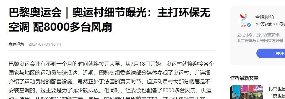 以上信息来源:青瞳视角2024年7月4日“巴黎奥运会|奥运村细节曝光:主打环保无空调 配8000多台风扇”