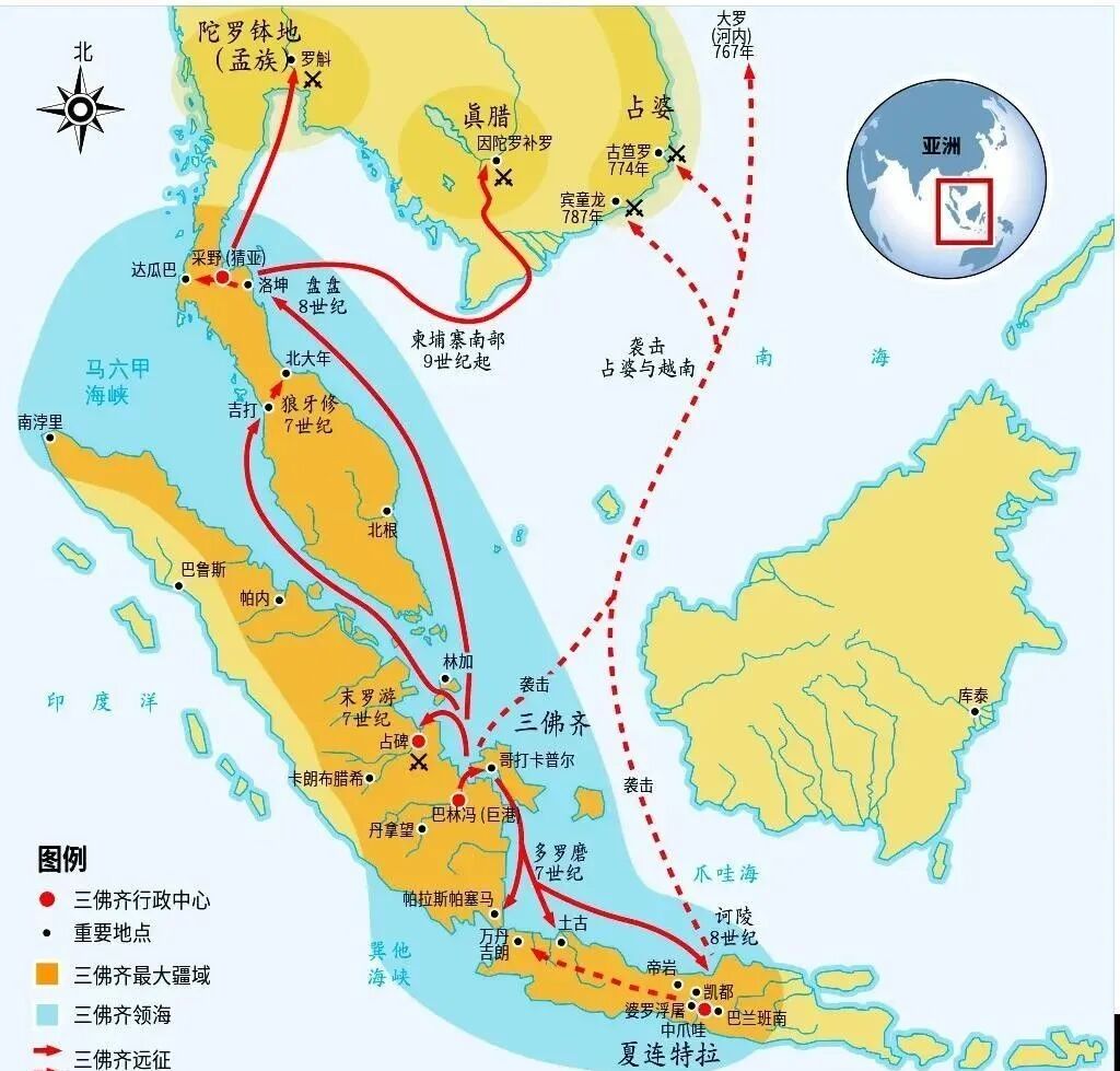 据中国史籍记载,7世纪,苏门答腊岛上有两个最大的国家,一个是末罗瑜,就是马来一词来源的地方,它本身也是个城市和港口;另一个是室利佛逝,信奉大乘佛教,也是个城市和港口,位于今天印尼的巨港一带,中国史书后来称之为三佛齐。