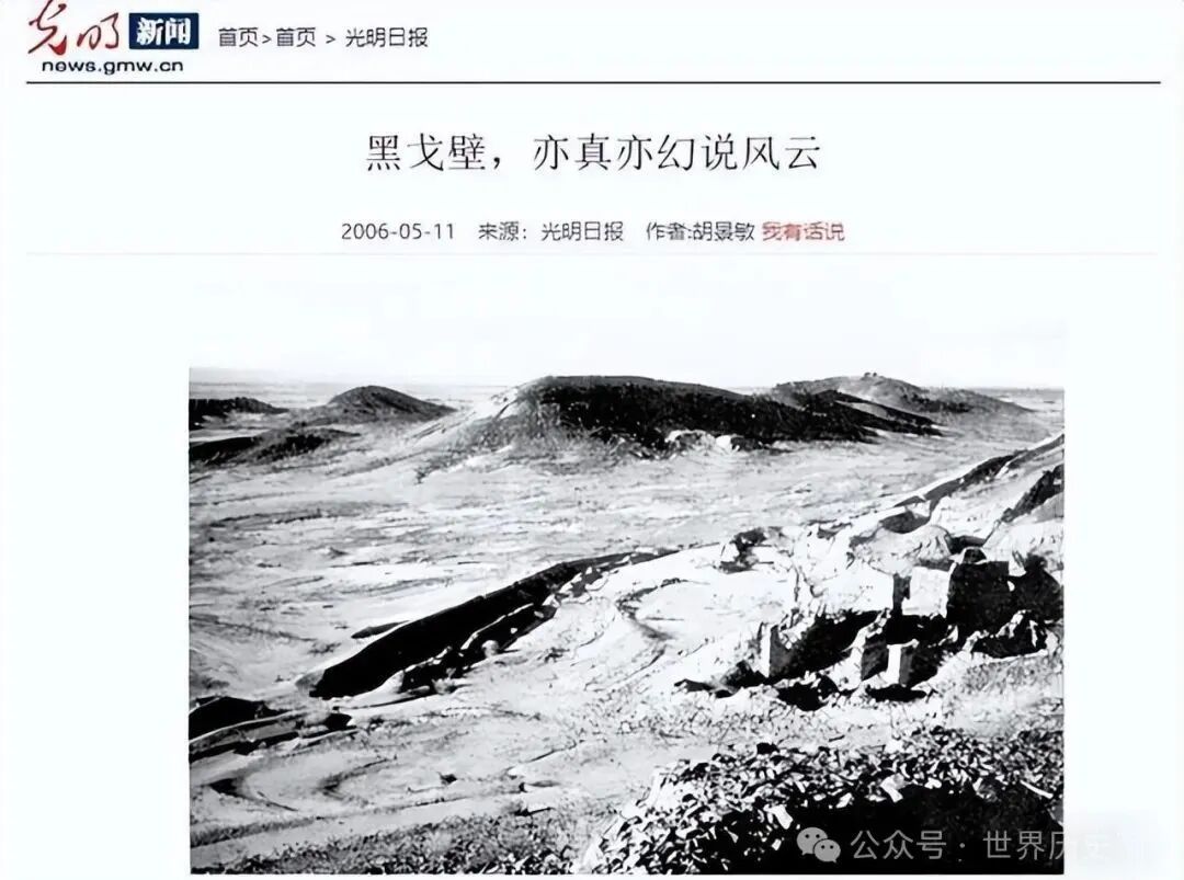参考消息来源,2006年5月11日的光明日报——在神秘的黑色戈壁滩上,风云变幻莫测,仿佛在讲述着真实而又奇幻的故事。