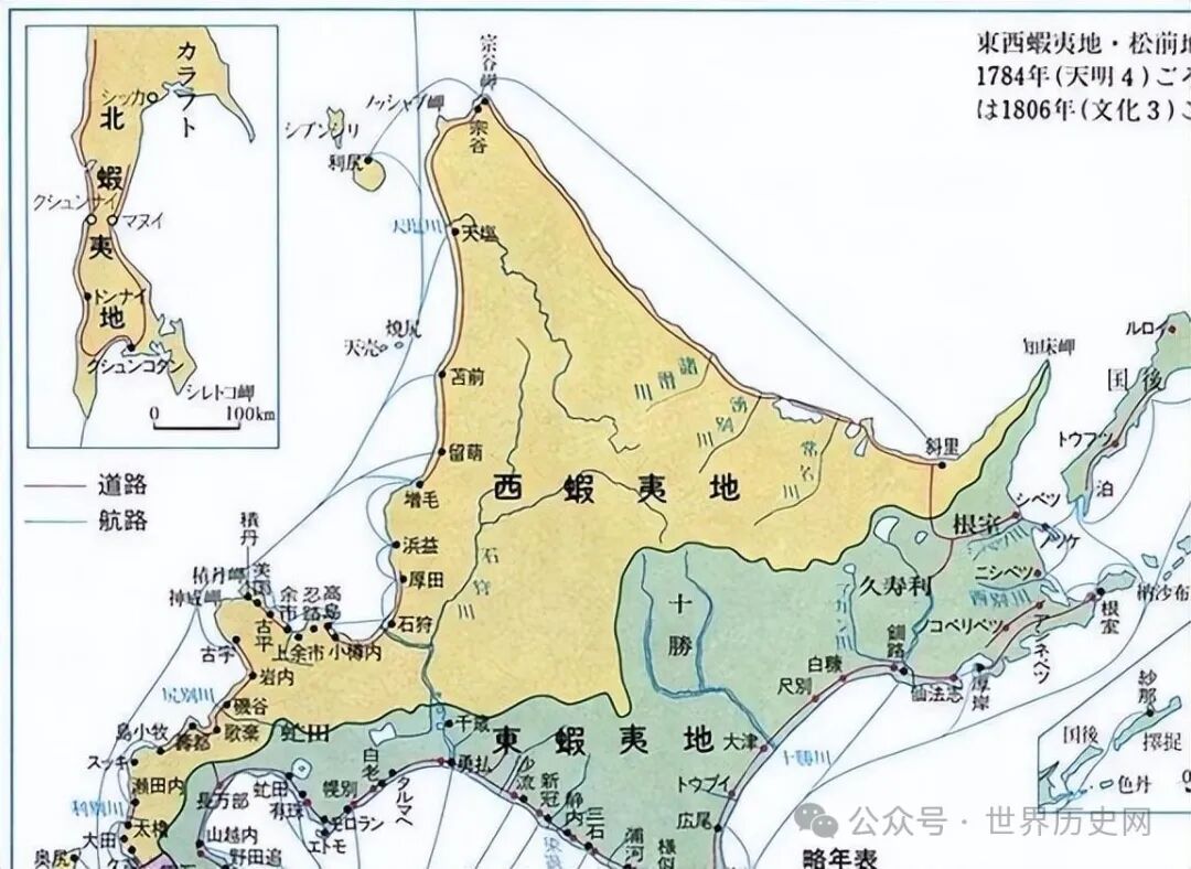 到了公元1593年在历经持续数百年的征服活动后阿伊努族聚居的北海道被丰臣秀吉正式吞并。同年丰臣秀吉派遣大将松前庆广以北海道为基地出征库页岛南端。日本在出征库页岛的同时也将扩张的触角伸到了邻近的千岛群岛。公元1635年日本方面派村上扫部左卫门巡视库页岛。公元1644年在松前藩的提议下日本方面绘制了《正保御国绘图》:在这张地图中首次把北海道、库页岛以及千岛群岛等原本由当地原住民居住的地方划入日本版图。
