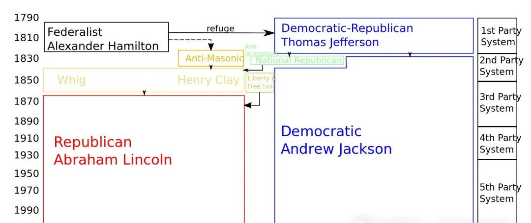 美国政党体系示意图,此图按5个时期划分美国政党体系