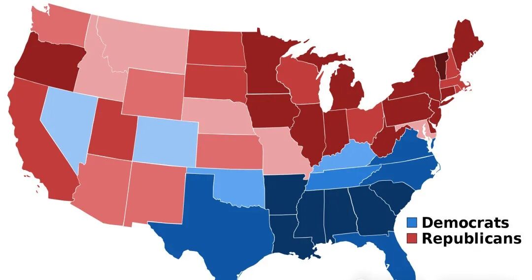 第四政党体系势力范围,蓝:民主党,红:共和党