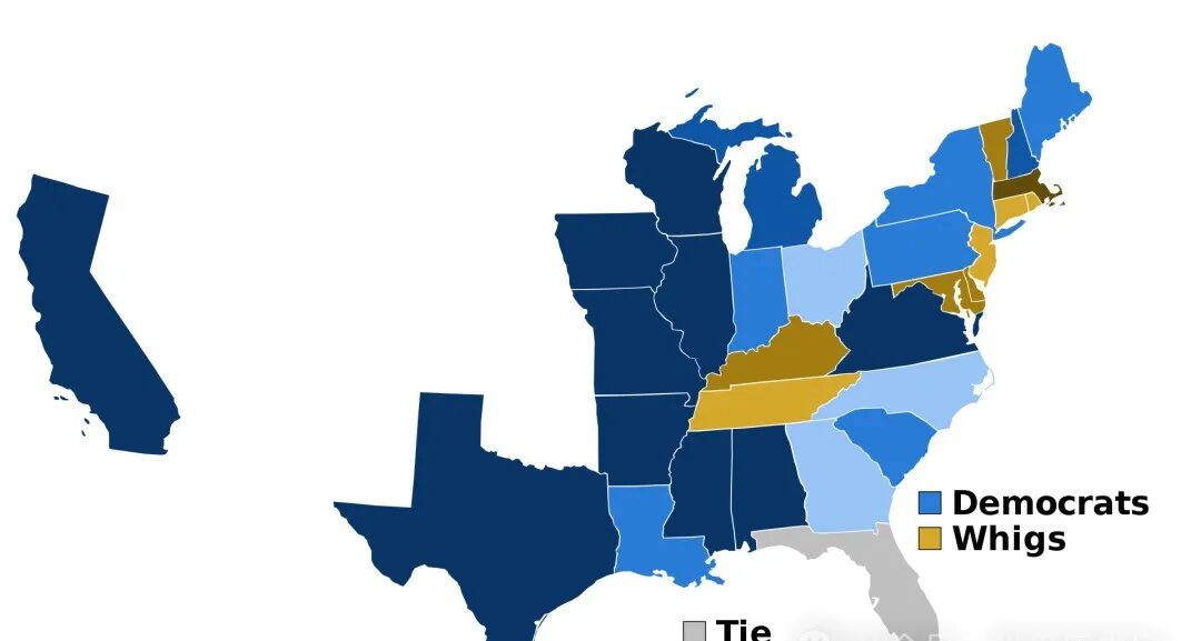 第二政党体系势力范围,蓝:民主党,黄:辉格党