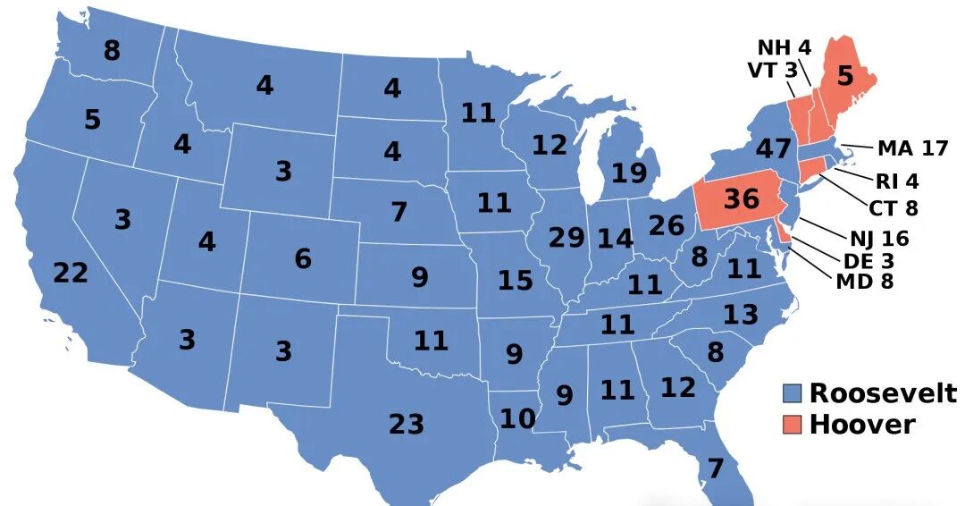 开创了第五政党体系的1932年大选形势,蓝:民主党,红:共和党