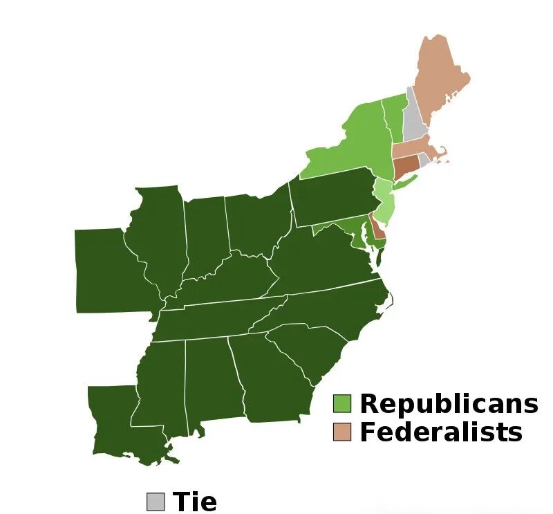 在联邦党逐渐消亡之后,一些前联邦党人也转投了民主共和党旗下。但此时一家独大的民主共和党却也很快发生分裂,在公元1824年的美国大选中发生了严重内讧。此后,民主共和党很快分裂成为了由前联邦党人、当时成为了美国总统的约翰·亚当斯所领导的国家共和党和由落败的安德鲁·杰克逊所领导的民主党。
