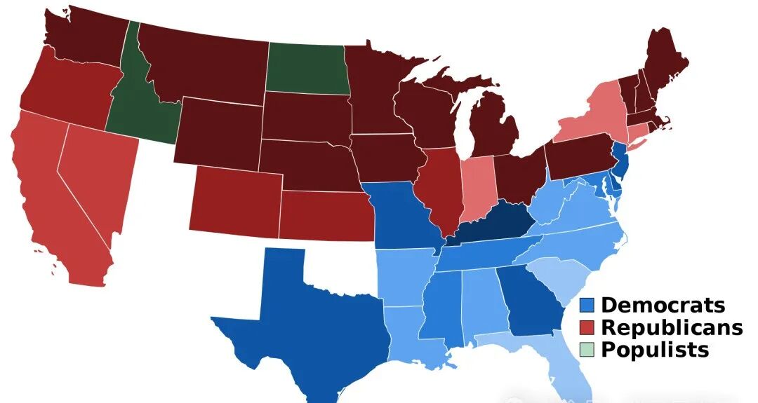 第三政党体系势力范围,蓝:民主党,红:共和党