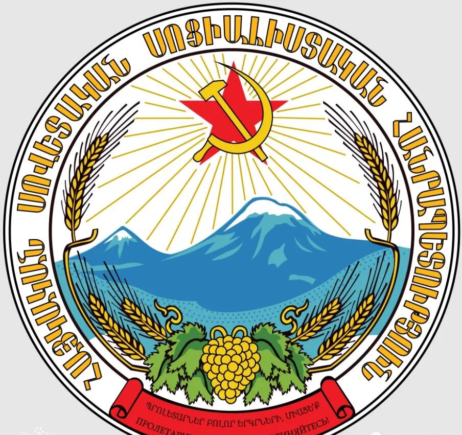 亚美尼亚苏维埃社会主义共和国时期国徽,外圈为亚美尼亚文书写的国名和俄文、亚美尼亚文的格言,内部有镰刀锤子、麦穗、葡萄和阿勒山。