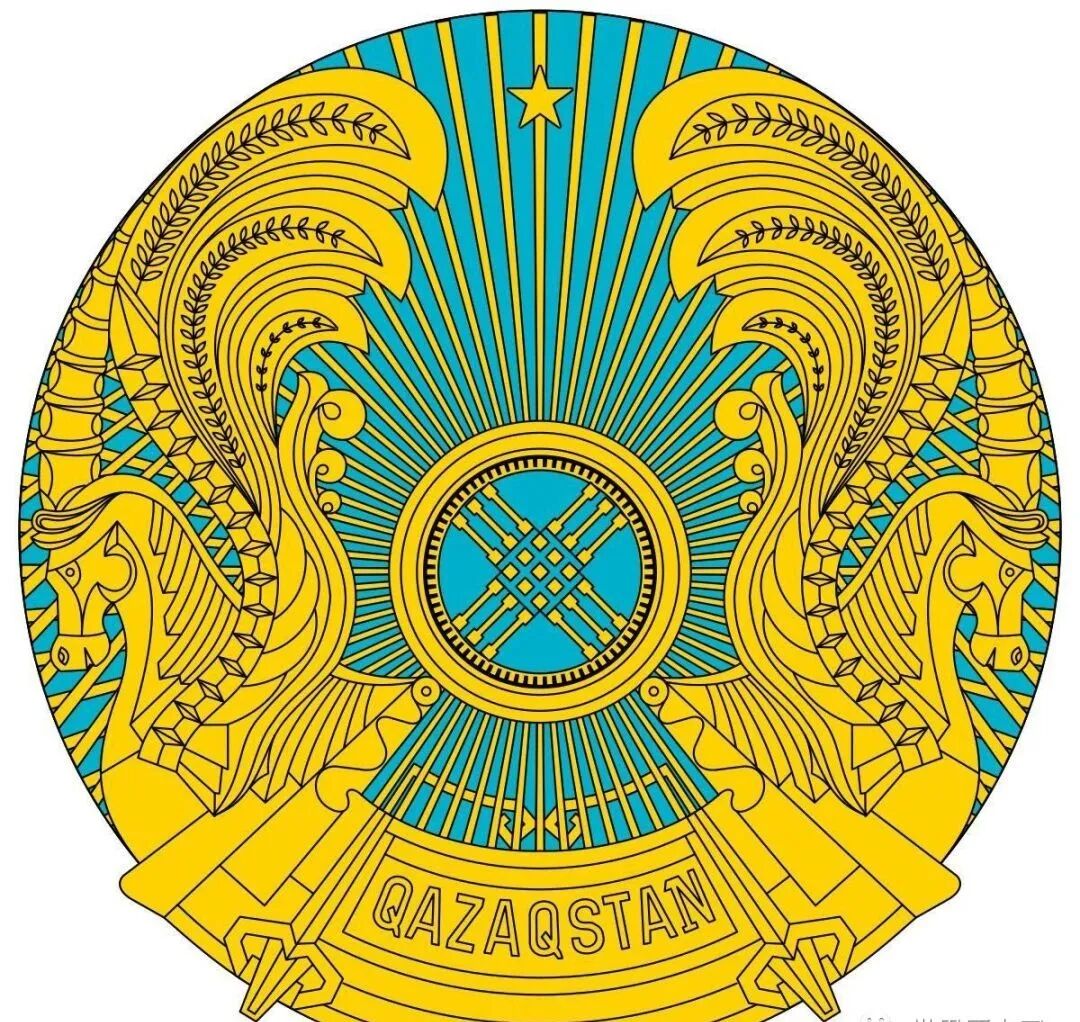 独立后的哈萨克斯坦国徽,主体图案为传统的毛毡圆顶帐篷,飞马象征游牧生活。