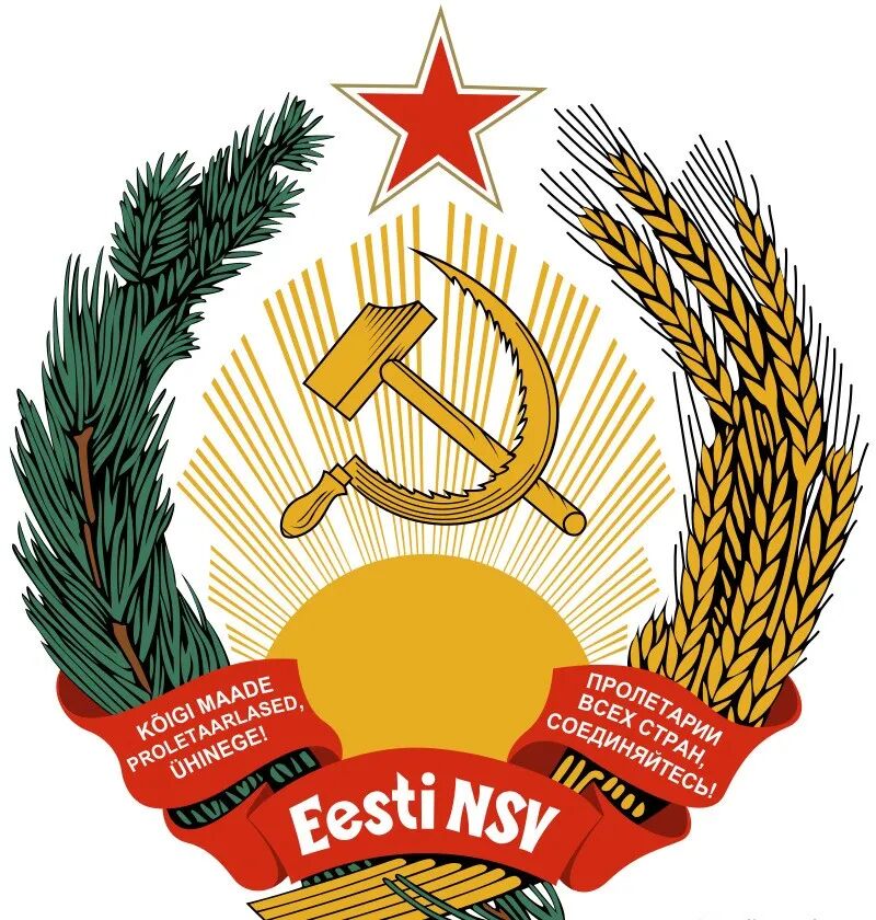 爱沙尼亚苏维埃社会主义共和国时期国徽,中间图案差别不大,左侧为松针,右侧为麦穗,饰带上为俄文和爱沙尼亚文书写的格言和爱沙尼亚文的国名缩写。