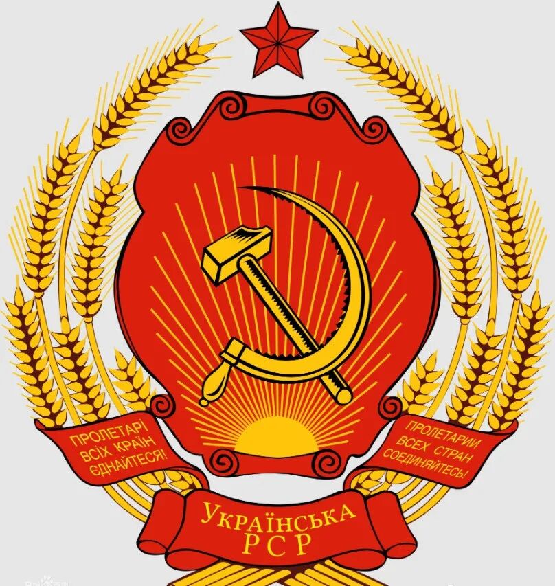 乌克兰苏维埃社会主义共和国时期国徽,由旭日、盾牌、镰刀锤子、麦穗、红色五角星图案组成。下方饰带上为乌克兰语的国名缩写,两旁分别为俄文和乌克兰文的格言:全世界无产者,联合起来!