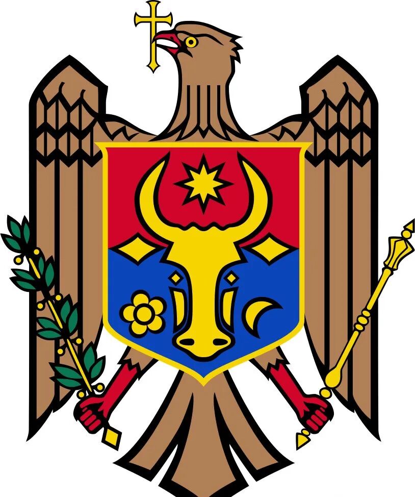 独立后的摩尔多瓦国徽,一只叼着金色十字架的国鸟白鹳,两只爪子抓着橄榄枝和权杖。中央盾形中为象征正义的公牛头和鲜花、新月、八角星等图案。