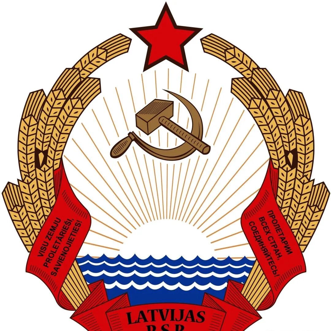 拉脱维亚苏维埃社会主义共和国时期国徽,中间为旭日初升的波罗的海。两侧为麦穗和以俄文、拉脱维亚文书写的格言,下方为拉脱维亚文书写的国名缩写。