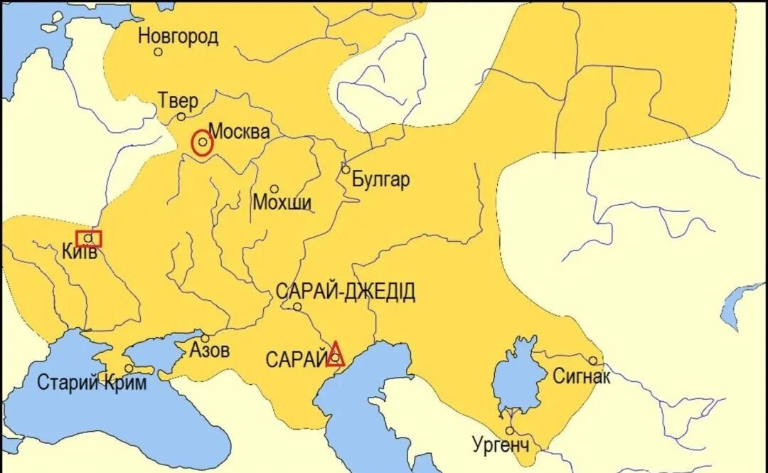 金帐汗国鼎盛期版图,图中圆圈处为今俄罗斯首都莫斯科,方框处为今乌克兰首都基辅,三角处为金帐都城萨莱