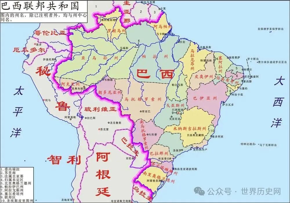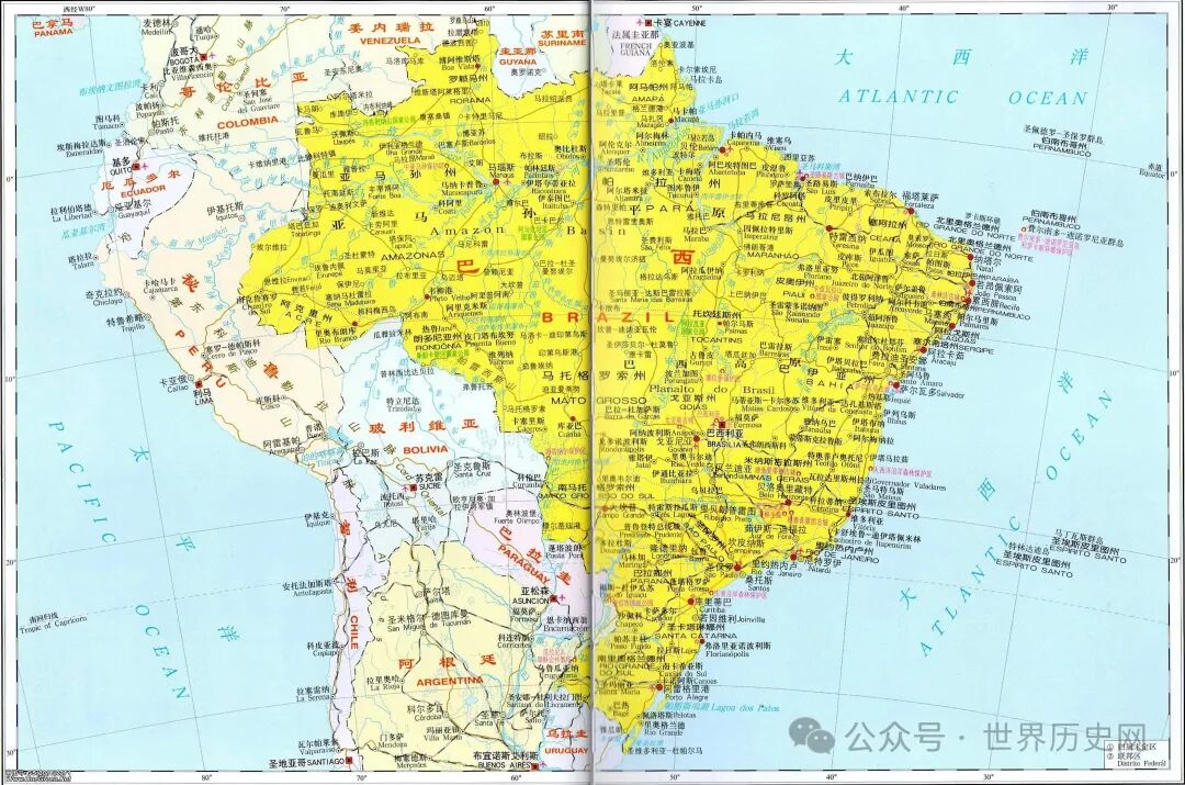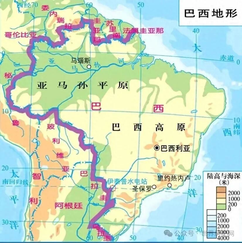 巴西位于南美洲东部,是南美洲最大国家,世界第五大国家,巴西北临法属圭那亚,苏里南,圭亚那,委内瑞拉和哥伦比亚,西接巴拉圭,阿根廷和乌拉圭,国土80%位于热带地区。巴西国土面积为851万平方千米,陆地面积为835.8万平方千米,水域面积为15.7万平方千米。巴西是世界上南北延伸最长国家。