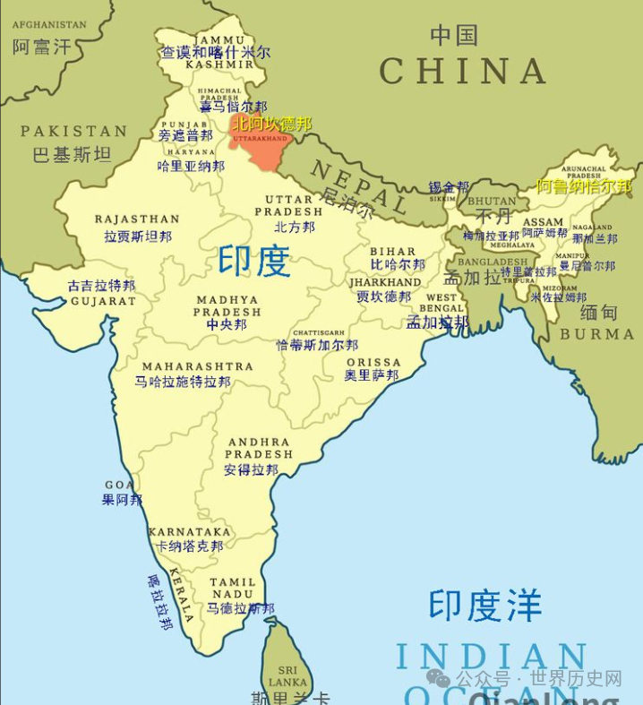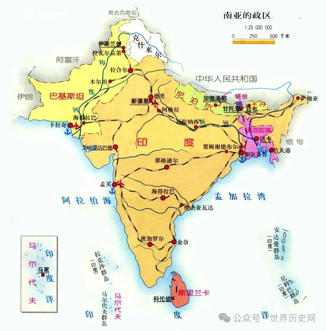 印度是南亚次大陆面积最大国家,临阿拉伯海和孟加拉湾,同中国,尼泊尔,不丹接壤,东北国土围绕孟加拉国,东部与缅甸为邻,东南部与斯里兰卡隔海相望,西北部与巴基斯坦交界。印度有两个群岛,拉克沙群岛,安达曼和尼科巴群岛,拉克沙群岛是印度西海岸附近珊瑚环礁,安达曼和尼科巴是安达曼海火山链条。印度国土面积为298万平方千米,还控制邻国20万平方千米领土。