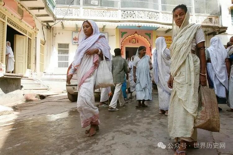 一旦失去丈夫,这些女性便会遭受非人的虐待。人们会强行剃光她们的头发,砸毁象征其已婚身份的手镯,迫使她们只能依靠乞讨维持生计。