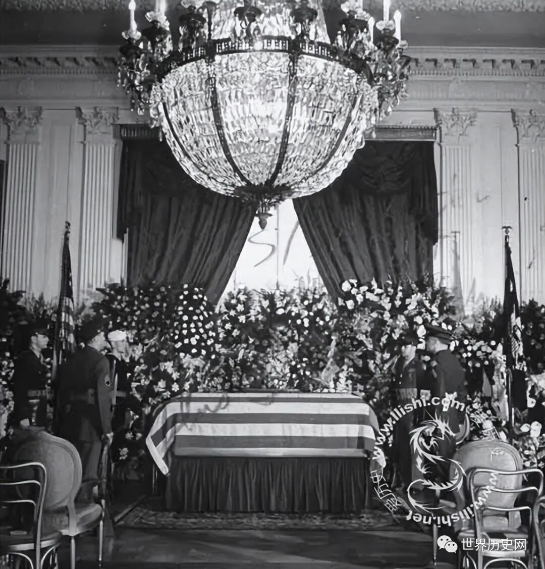 富兰克林·罗斯福在战争中付出了巨大的努力和牺牲,也取得了辉煌的成就。他在1944年再次连任总统,成为美国历史上唯一连任四届的总统。但是,他的健康状况日益恶化,他在1945年4月12日去世于乔治亚州温泉(Warm Springs),享年63岁。