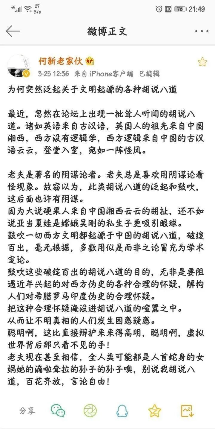 中国人,自信一点,实事求是的欣赏祖先的遗产和思想,投入到今天国家的发展中,就足够令人感到自豪了。真的要破除西方伪史,那你们写英文的帖子和书,发到国外的出版社和404的网站去呀?对着本国人胡搅蛮缠,止增笑耳。