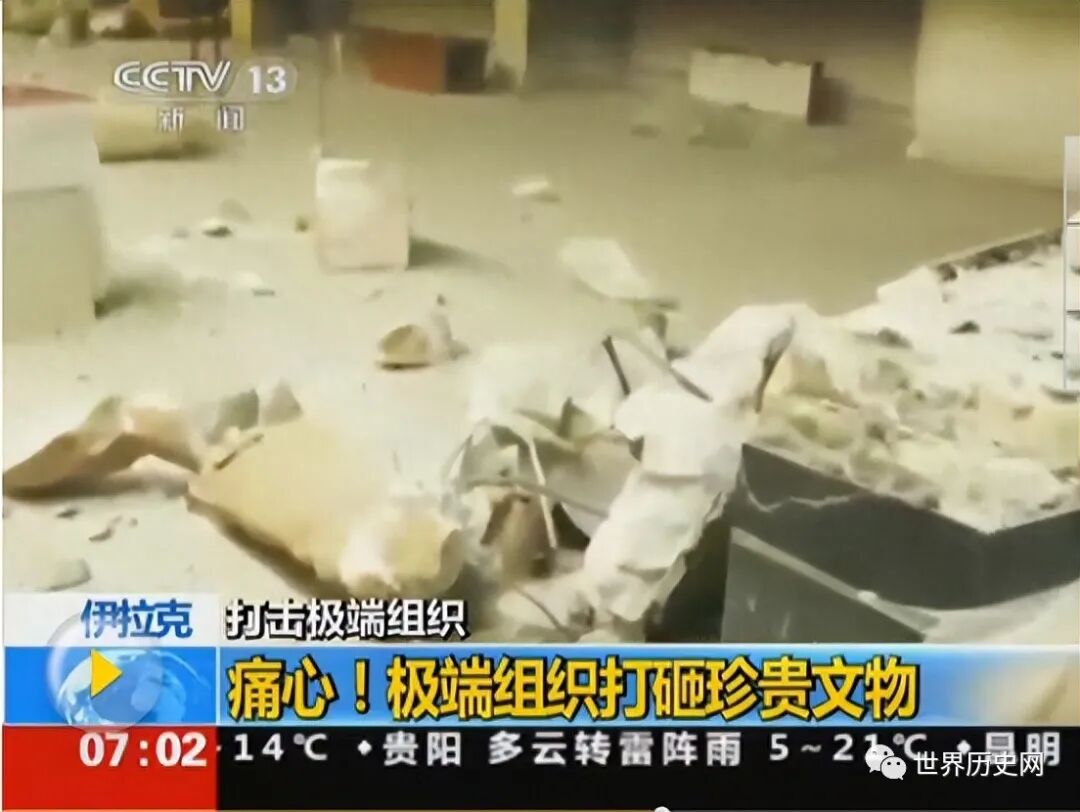 【图片】新闻画面,可以看出部分被砸的来自摩苏尔博物馆的雕像中有铁架,显然是现代复制品。