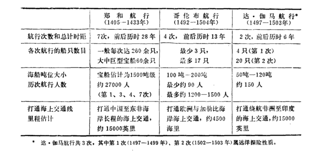 从上述粗略的东西方对比中,可以明确地得出这样的结论:在15世纪大航海探险开始时,中国的社会、经济、政治、技术发展水平都远远高于西方。同样就欧亚大陆两端发动的海洋开拓运动而论,郑和下西洋的规模、行程、航海组织等方面都超过哥伦布航行和达•伽马航行,达到时代的高水平。这里将三大航行的几项可比指标,列表如下: