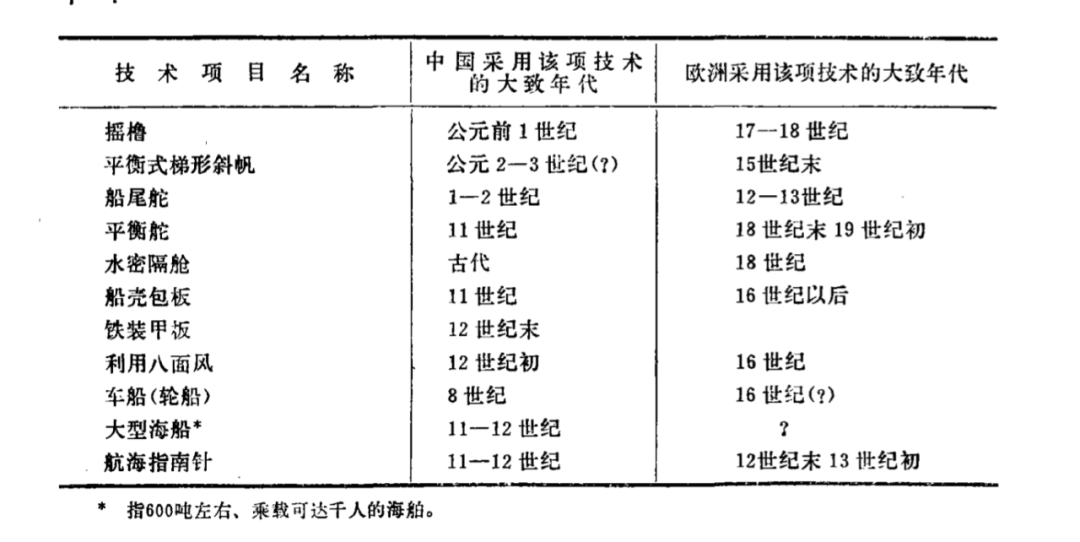 从上表可以看出,中国在造船和航海技术的许多方面都远远领先于欧洲,其中有关船体推进的各种工艺应用,领先于欧洲1000多年。由于这些先进的工艺,中国在内河和近海航行方面早已取得突出成就。例如,宋元时代沿海的北洋漕运用船一两千只,大者八九千料,小者二千余石,其规模之大,恐为举世少见。远洋航行到11—12世纪以后也日趋活跃,中国海舶频繁地驶向广大的亚非海域。当时中国所造的大型海舶已长达二三十丈,载乘六七百人。中国的贸易船到波斯、阿拉伯国家,要在故临(斯里兰卡)换乘较小船只,而东来的阿拉伯商人行船到故临则要换乘中国的大船东行,因大船具有更强的抗海涛能力。由此可见这一时期中国海船在印度洋上所扮演的重要角色。