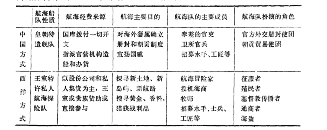 两种完全不同的远洋航行的组织方式,是两种不同的社会经济体制所决定的,在欧洲的航海探险和远洋贸易中,已经出现了王权向私人或商业公司转让专属所有权和特权的趋势。朝廷或王室通过这种方式鼓励私人甚至包括受雇的外国人去进行冒险事业和创新活动,为新的财富和商业资本的大发展创造了条件。这是西方所有权的制度结构开始改变的一个重要开端,而中国却仍然是在传统的制度结构中发展。这两种不同的航海队伍的组织方式和任务,可大致列为下表: