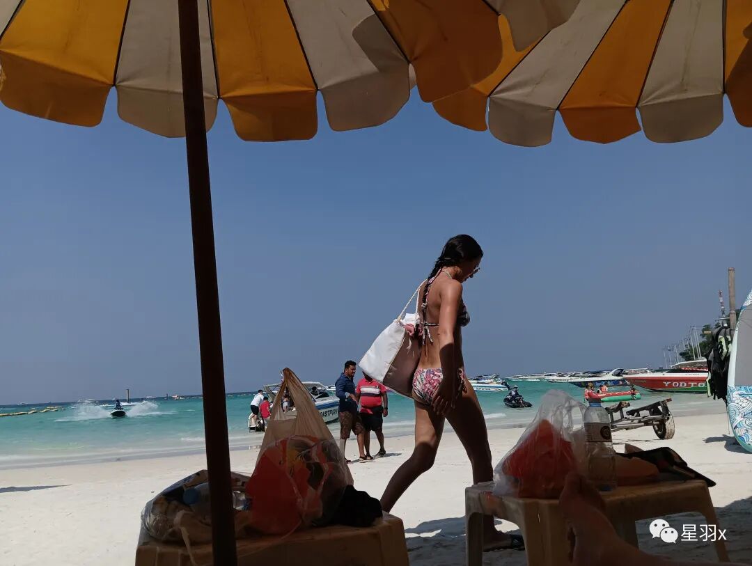 码头栈桥尽头,随着岛上山势左右分开,右边好像是个度假村,我们选择了左边人流多,进市场的大道,这里就是一边沙滩,一边市场,由于太阳很晒,我们经过一番挣扎,还是放弃了租车环游岛屿的想法,租了沙滩躺椅坐了下来。