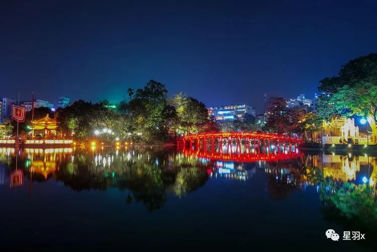 栖旭桥是一条木结构的拱桥,东西走向,越南人民就在桥上人挨人,交流聊天看风景,成双成对者较多,我挤不进去,桥尽头玉山寺晚上是关着的,只有白天才能进去看看,有空我会具体写,今晚就只有算了。