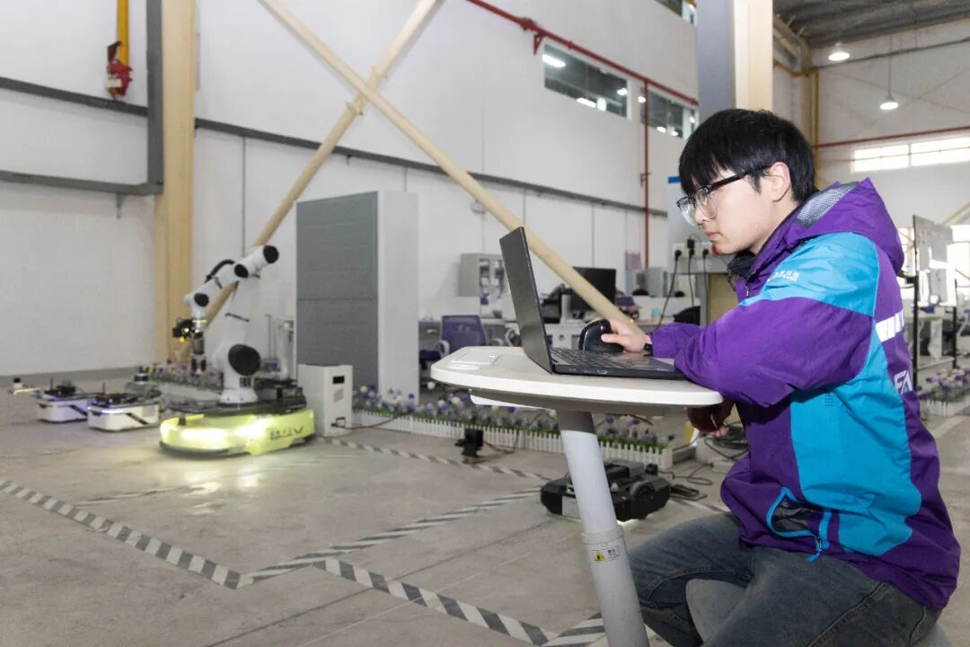 ▲周博士调试“鲲鹏”系列主线移动机器人。