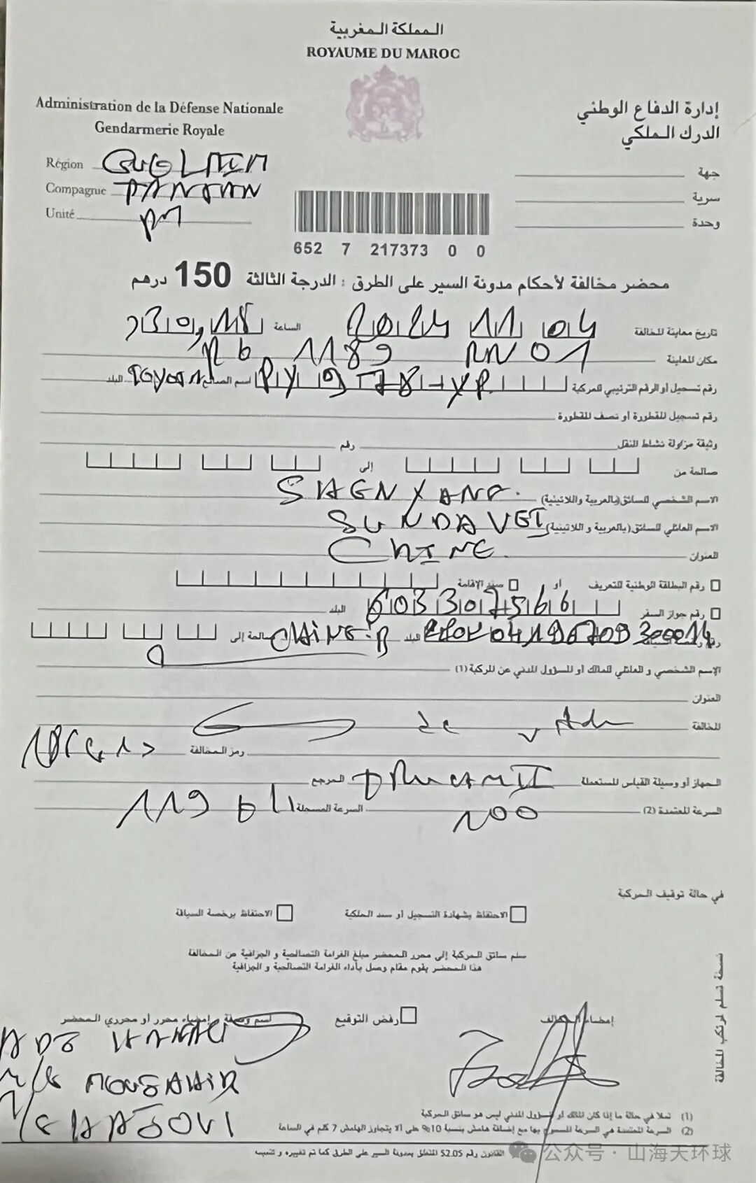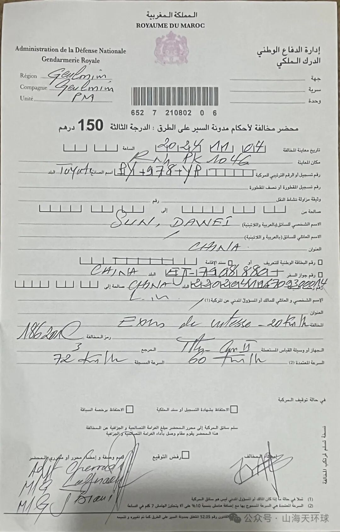三、摩洛哥西撒哈拉沙漠公路超速罚款,现场开罚单,收现金。