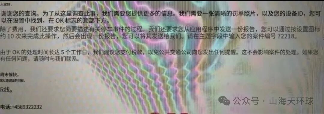 2024年7月31日,在丹麦哥本哈根第二天晚上入住一家青旅,没有停车位,只有自己找路边收费停车位停车,队友用信用卡在收费机上支付了停车费,不知道什么原因,没有缴款凭证,所以车辆的挡风玻璃上没有放置交款凭据,第二天早上去开车,发现车窗上贴有违章停车告知书,立即与青旅前台联系,首先通过前台用丹麦语电话沟通,之后获得主管部门的邮箱,把我们停车相关的信息及支付停车费的凭证提交,对方要求我们先交纳罚款,等待处理结果,但是不知道如何网上缴费。队友通过其夫人(海关国际某协会主席)在布鲁塞尔总部的工作人员出面交涉,终于同意我们暂缓付款,交涉成本远远超过几百元人民币的罚款,队友及海关某国际协会的工作人员写过几封邮件沟通,至今还没有最后回复,扣款账号已告知对方,但是至今也没有扣款。估计这件事会不了了之,在此严重感谢队友及其夫人的付出。