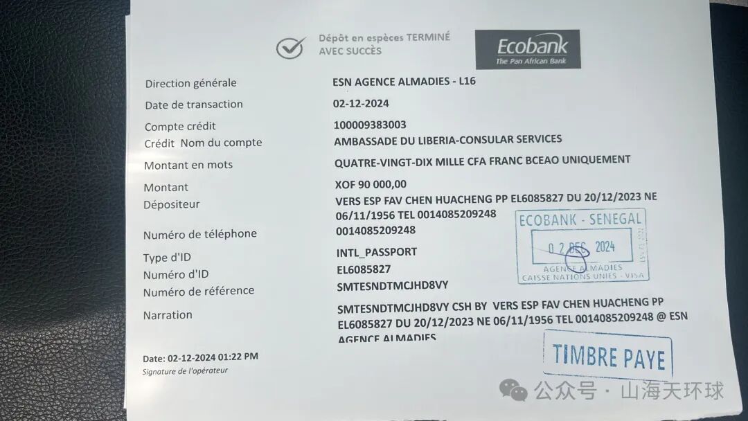 到达利比里亚大使馆,第一要务就是填写申请表,队友蒋哥第一个帮我填好表,拿去给签证官审核,指出利比里亚的宾馆订单需要复印一人一份,说附近就有复印店,拍照队友预订的酒店订单后,在门口问保安哪里有打印店?保安用手指向前,徃右又往左,听得我一头雾水,最后他带我走了近500米才到,跟店员说了几句就走了。