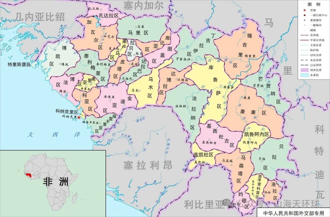 几内亚共和国,简称几内亚,位于西非西岸,西濒大西洋,国土面积245857平方公里,全国共有7个大区和1个首都科纳克里市(与大区同级)、33个省、304个专区,人口1504万(2022年),全国有20多个民族,约占全国人口的40%以上,马林凯族约占30%以上,苏苏族约占20%。[1]