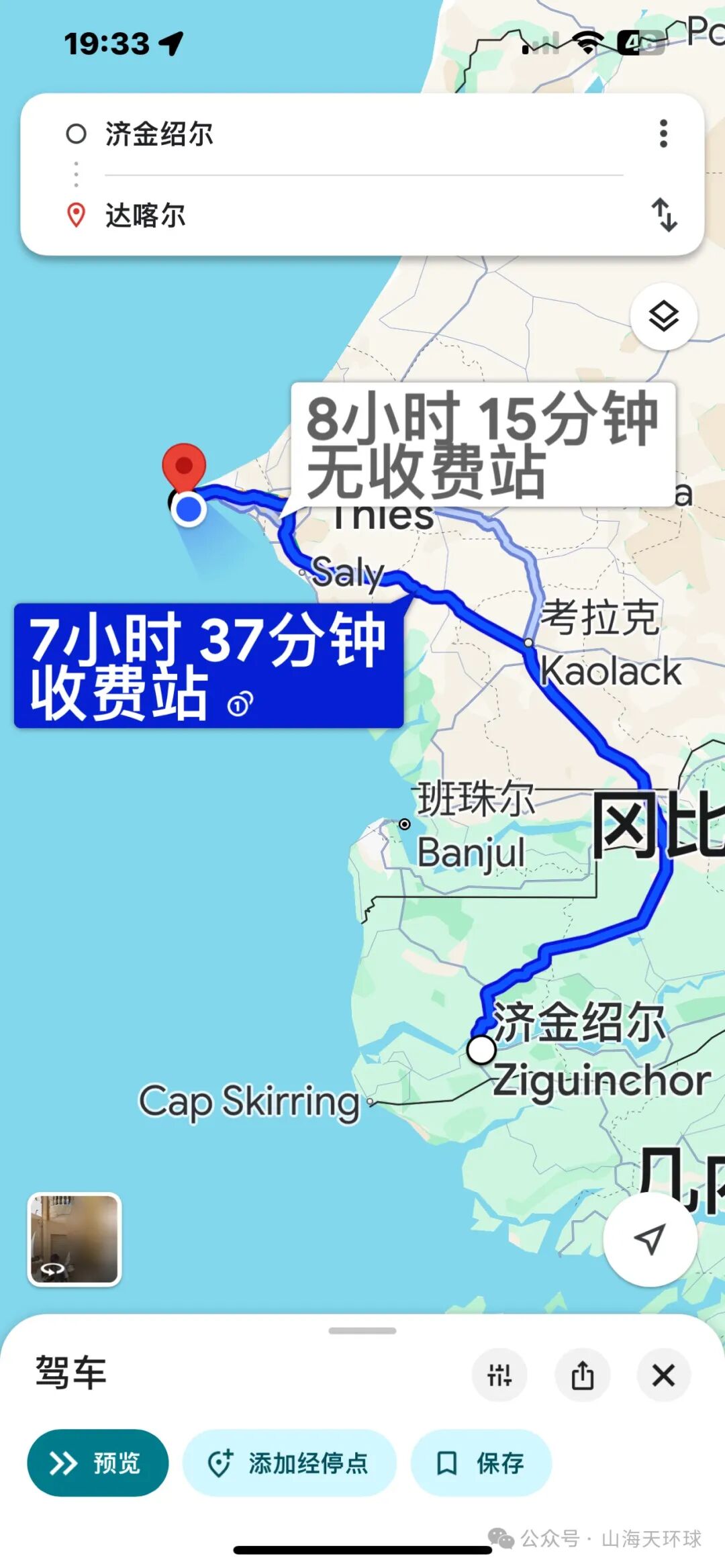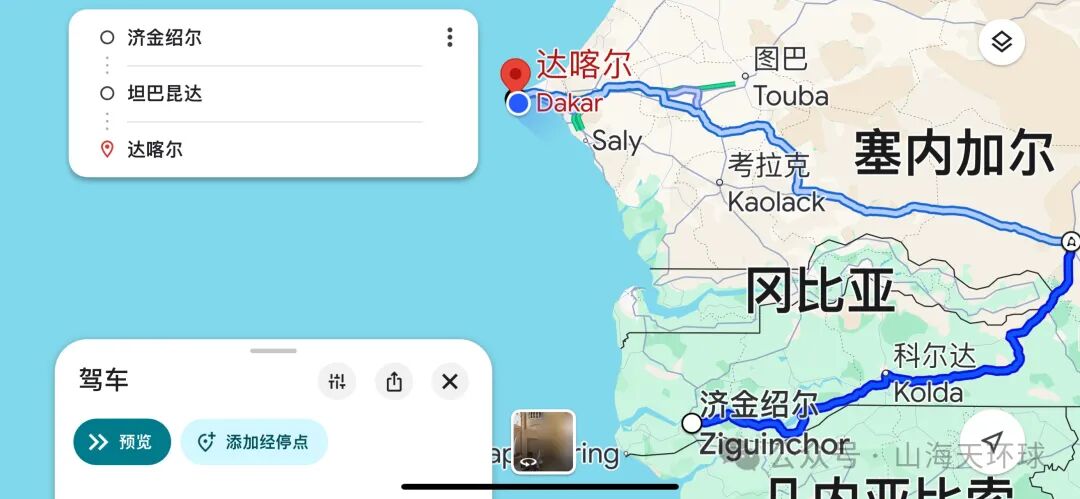第一:公路穿越冈比亚,路程500公里左右,优点是路程短,缺点是需要穿越一个国家,办理进出境手续比较麻烦。