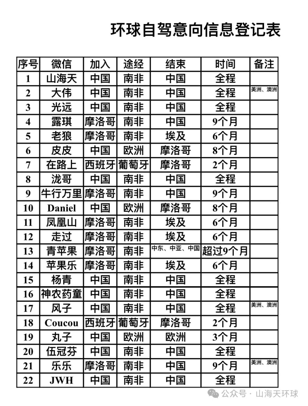 以上建立环球自驾报名群时统计表,后来的统计表现在不开报名人数应该在三十人以上