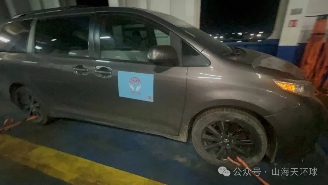 合资购买的丰田赛纳四驱商务车,在横渡2000公里黑海的渡轮上,被牢牢地绑在船舱中。