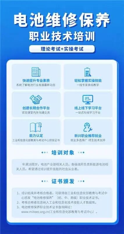 1、培训结束并考核合格者,可获得由工业和信息化部教育与考试中心颁发“电池维修保养”(初、中、高级)职业技术证书。