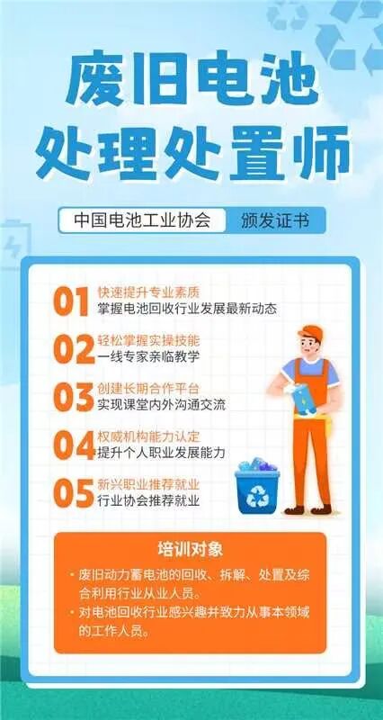 参与培训并考核合格的学员将获得由中国电池工业协会授予的“废旧电池处理处置师”职业能力水平评价证书,证书全国流通。