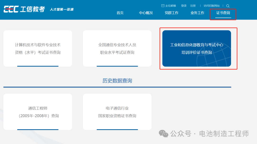 ①在工业和信息化部教育与考试中心官网首页中点击证书查询页面。