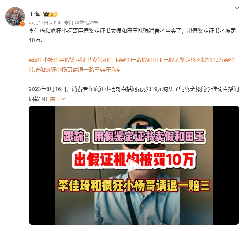 比如,因产品品质被质疑有问题,而被打假。7月17日,王海发布视频微博称:李佳琦小杨哥用假鉴定证书卖假和田玉欺骗消费者坐实了,出假鉴定证书者被罚10万。