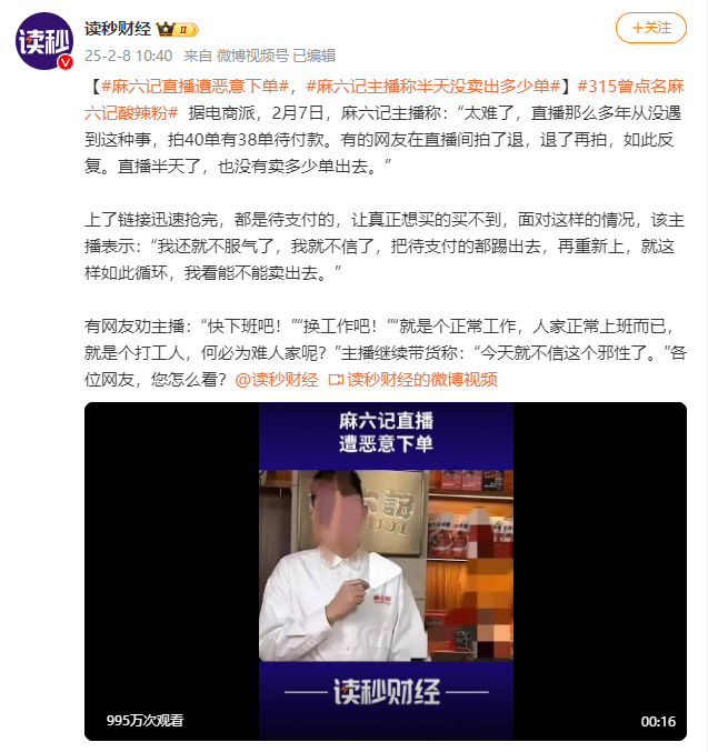 据报道,麻六记的直播间虽然还在正常直播,但遭遇了大规模的恶意下单:用户反复拍下商品后取消订单,导致真实消费者无法购买,直播间销售额大打折扣。