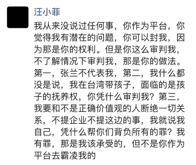 而除了炮轰亲妈,汪小菲还在朋友圈喊话抖音平台,认为自己遭到封禁是平台对自己的“审判”与“霸凌”,强调:“张兰不代表我,你凭什么审判我?”