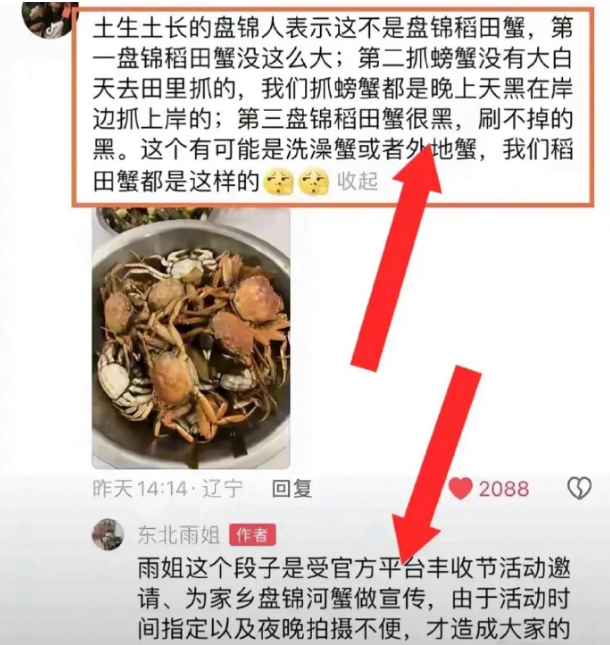 而更早前因带货问题翻车的“东北雨姐”,也一度被指出“亲自下地抓稻田蟹”的视频属于摆拍。