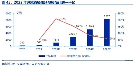 艾媒咨询数据显示,随着TIKTOK电商平台的迅速发展,各大平台也将发力跨境直播电商,预计2025年跨境直播电商市场规模将达到8287亿。