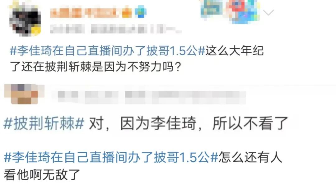 有网友犀利点评:“这么大年纪了还在披荆斩棘是因为不努力吗?”“怎么还有人看他啊无敌了”,还有网友直接表示:“对,因为李佳琦,所以不看了”。
