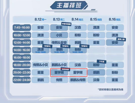 董宇辉也是一样,极少出现在直播间中带货。上周,也就是8月12日到8月16日,与辉同行的官方排班中,董宇辉只出现了两次。