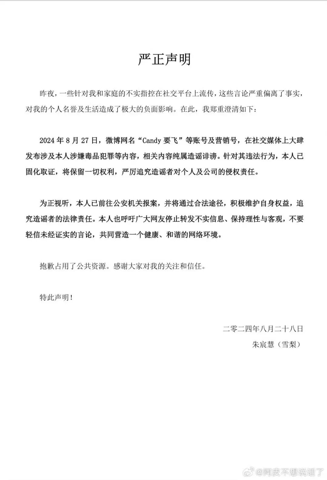 然而,面对“Candy要飞”的一连串“小作文”,雪梨并未有过多回应只在微博账号“阿皮不想说话了”发布声明,否认吸毒指控,并表示针对造谣内容已向公安机关报案。