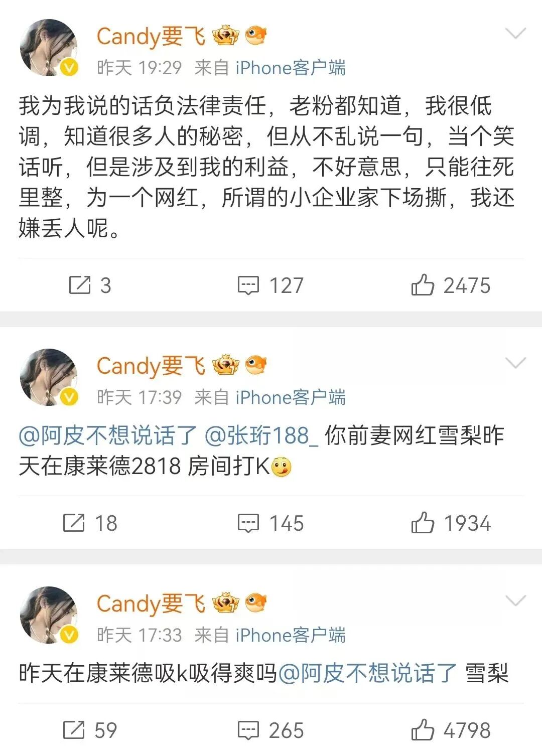 事情到发展到这里大概就捋清了——“Candy要飞”老公和雪梨在同一个酒店房间里“鬼鬼祟祟”,“Candy要飞”过来敲门,雪梨半天不敢出来,“Candy要飞”老公则对“Candy要飞”撒谎,捏造了吸毒的事,“Candy要飞”信了她老公的话在微博上写“小作文”把事情闹大。