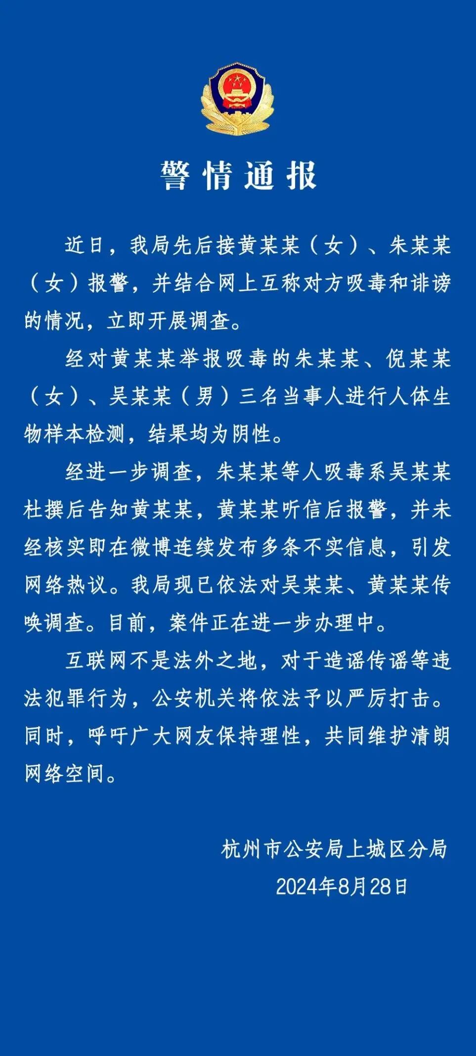 经进一步调查,朱某某等人吸毒系吴某某杜撰后告知黄某某(“Candy要飞”),黄某某听信后报警,并未经核实即在微博连续发布多条不实信息,引发网络热议。我局现已依法对吴某某、黄某某传唤调查。目前,案件正在进一步办理中。