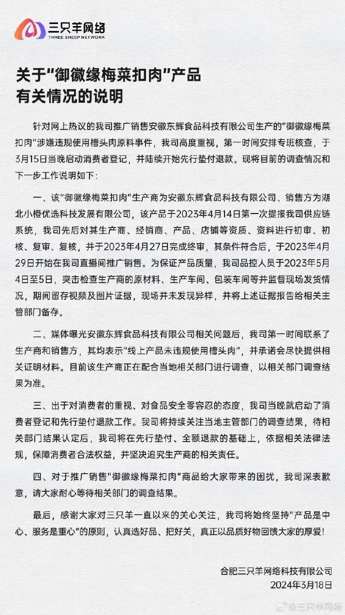随后,辛选官方微博作出了正式回应,称将产品送至实验室进行进一步检测,并承诺一旦消费者对产品不满意,可以向“茗挚”天猫旗舰店申请退货退款。